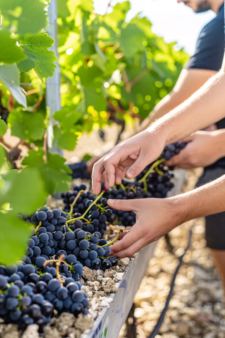 Récolte réalisée à la main pour sélectionner les raisins à parfaite maturité.